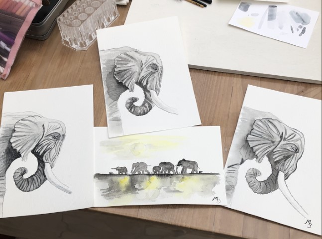 We starten terug met workshops aquarel. Zin in een beetje me-time? Kom gezellig mee doen. Geen schrik hebben want ik begeleid jullie bij elke stap. Heb je interesse en wil je graag wat info? Stuur me een pb met je mailadres. Voor de workshop Olifanten 2 heb je wel een beetje ervaring nodig.